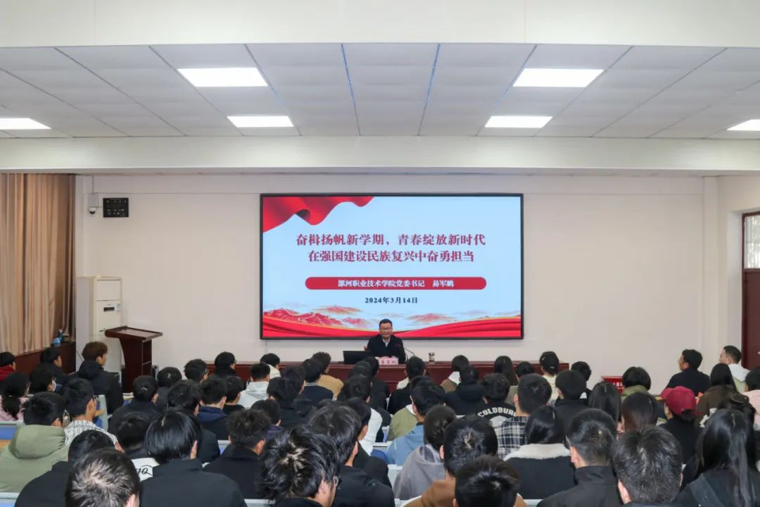 3月14日,漯河职业技术学院党委书记易军鹏讲授2024年春季开学思政第一课,学院马克思主义学院全体思政课教师和音乐舞蹈系、电气电子工程系、基础教育部100余名学生代表现场一同聆听了授课。 易军鹏围绕“奋楫扬帆新学期 青春绽放新时代 在强国建设民族复兴中奋勇担当”主题,以全国两会召开引入,传达了政府工作报告的主要内容特别是关于职业教育的工作部署,从“认识大学,发现自我,开启崭新篇”“知行合一,德技并修,成...
