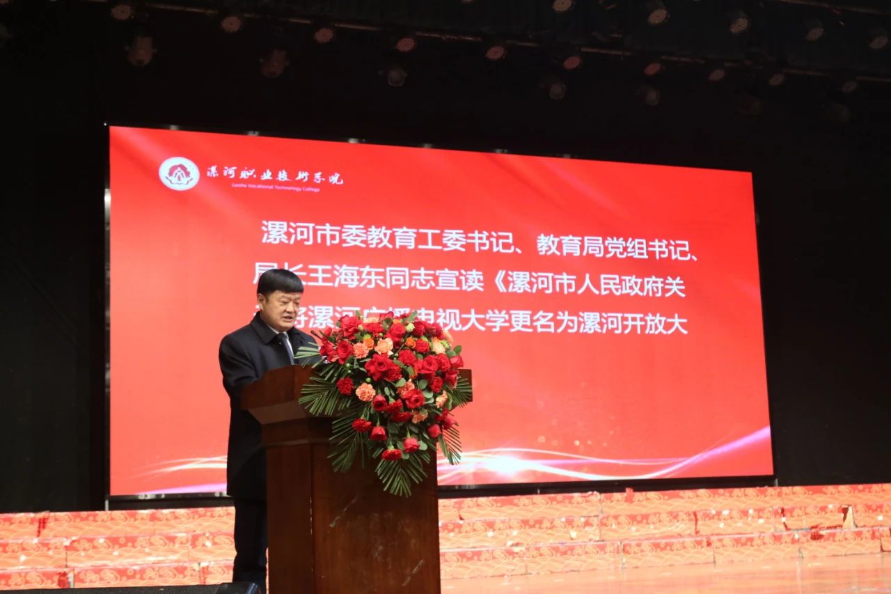漯河市委教育工委书记、市教育局党组书记、局长王海东宣读《漯河市人民政府关于将漯河广播电视大学更名为漯河开放大学的批复》。
