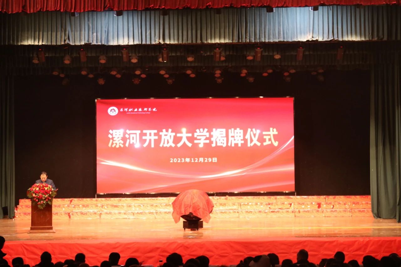 12月29日上午,漯河职业技术学院举行漯河开放大学揭牌仪式。漯河市人民政府副市长闫石,河南开放大学副校长张树军,漯河职业技术学院党委书记易军鹏,漯河市委教育工委书记、市教育局党组书记、局长王海东,漯河市委教育工委委员、市教育局党组成员、副局长高伟玲等领导出席了揭牌仪式,并共同为漯河开放大学揭牌。