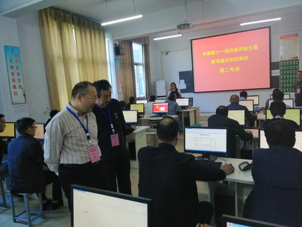 市委主题教育第十一巡回指导组组长、市交通运输局调研员汪继顺,巡回指导组副组长、市委教育工委委员、市教育局党组成员、副局长刘磊,巡回指导组联络员、市委组织部正科级组织员樊春光及指导组其他同志到考场巡视测试情况。