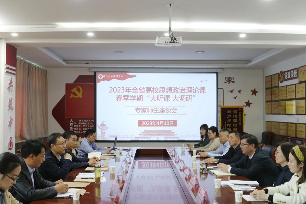 现场听课结束后,调研组和师生代表在行政楼会议室召开座谈会。座谈会上,党委书记易军鹏向调研组一行的到来表示热烈欢迎,他表示,校党委高度重视思政课建设,学校坚持“三个第一”理念,贯彻党委书记联系马院的原则,落实“领导班子带头上思政课”制度,拓展思想政治教育社会实践基地,在思政课教学中讲好专业故事、讲好本地故事,将思政课理论与实践相结合。党委委员、副院长程传蕊参会致词并对学校概况进行了简单介绍。思想政治理论部石俊霞主任就思政课开设、集体备课、教师授课、实践教学、努力方向进行了汇报。