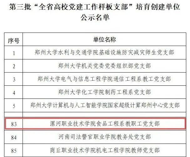 近日,中共河南省委教育工作委员会公示第三批“全省高校党建工作样板支部”培育创建单位名单,我校食品工程系教职工党支部成功入选。这是我校党建工作取得的又一重要成果,充分体现了学校基层党组织建设的扎实成效。