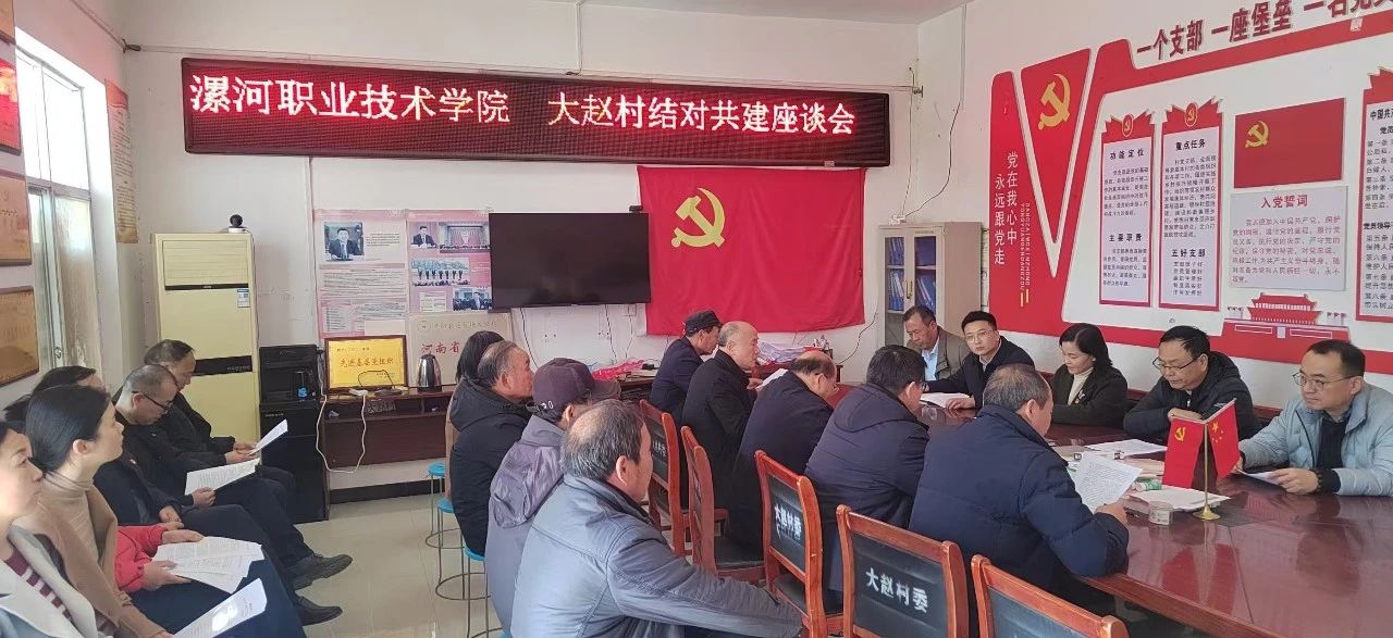 近日,漯河职业技术学院教务处党支部组织党员教师前往舞阳县莲花镇大赵村召开结对共建座谈会并看望慰问驻村干部和困难群众。漯河职业技术学院党委委员、副院长朱晓红,舞阳县莲花镇党委副书记、镇长于龙出席会议。漯河职业技术学院派驻大赵村第一书记、驻村队员及大赵村“两委”和监委会干部参加会议。