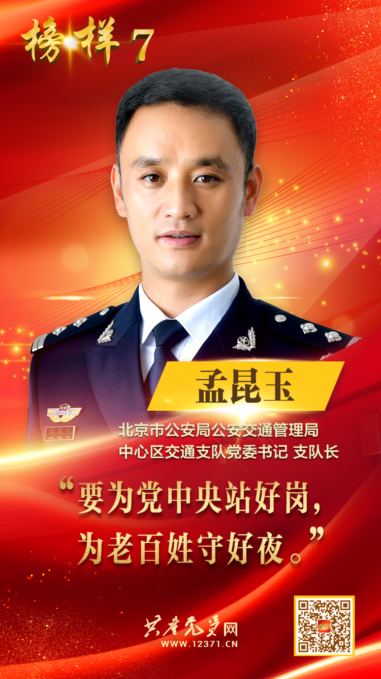 永葆忠诚本色,站好“首都中心岗”。2014年,孟昆玉调任中心区交通支队五中队任中队长,驻守天安门广场。为了有更好的仪表姿态,他带着同事们利用休息时间到国旗护卫队跟班学习,一年365天,每天两次,孟昆玉和战友们守护着五星红旗的朝升暮降,起三更、睡半夜是孟昆玉工作的真实写照。针对天安门广场、人民大会堂等区域重大国事外事活动多的情况,孟昆玉带领中队民警徒步测算各个岗位的距离,绘制“岗位说明书”,明确了多种日常交通疏导和活动交通保障的工作措施,科学控制车辆通行时间,各项重大活动的交通疏导实现了“零失误、零差错”。