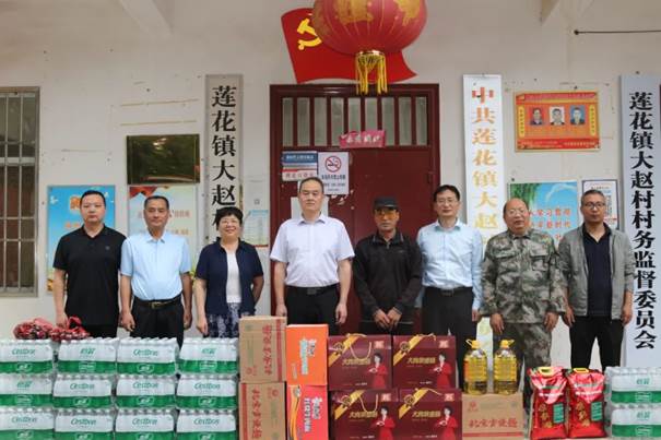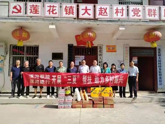 7月28日上午,漯河职业技术学院党委委员、副院长岳春洲一行、建行漯河分行嵩山路支行副行长潘新平一行,深入舞阳县莲花镇大赵村调研指导结对共建工作,看望慰问驻村干部,送去米面油、纯净水、方便面、火腿肠等物品。座谈会上,先后听取了驻村第一书记翟迎朝工作汇报和大赵村党支部书记、村委会主任赵连会村情介绍,了解了大赵村发展壮大集体经济,推进乡村振兴情况。岳春洲一行先后参观了大赵村村容村貌和学院支持建设的蟠桃、...