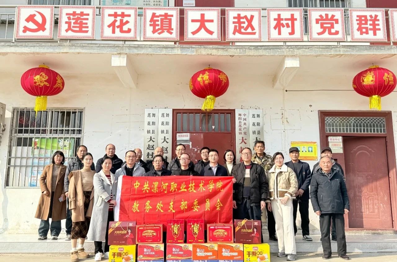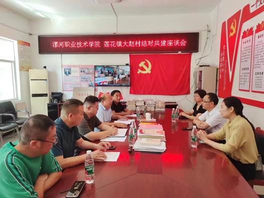 近日,漯河职业技术学院教务处党支部组织党员教师前往舞阳县莲花镇大赵村召开结对共建座谈会并看望慰问驻村干部和困难群众。漯河职业技术学院党委委员、副院长朱晓红,舞阳县莲花镇党委副书记、镇长于龙出席会议。漯河职业技术学院派驻大赵村第一书记、驻村队员及大赵村“两委”和监委会干部参加会议。座谈会上,朱晓红听取了驻村工作开展情况汇报,并就大赵村推进乡村振兴等工作进行深入交流,提出指导性意见建议。朱晓红表示...